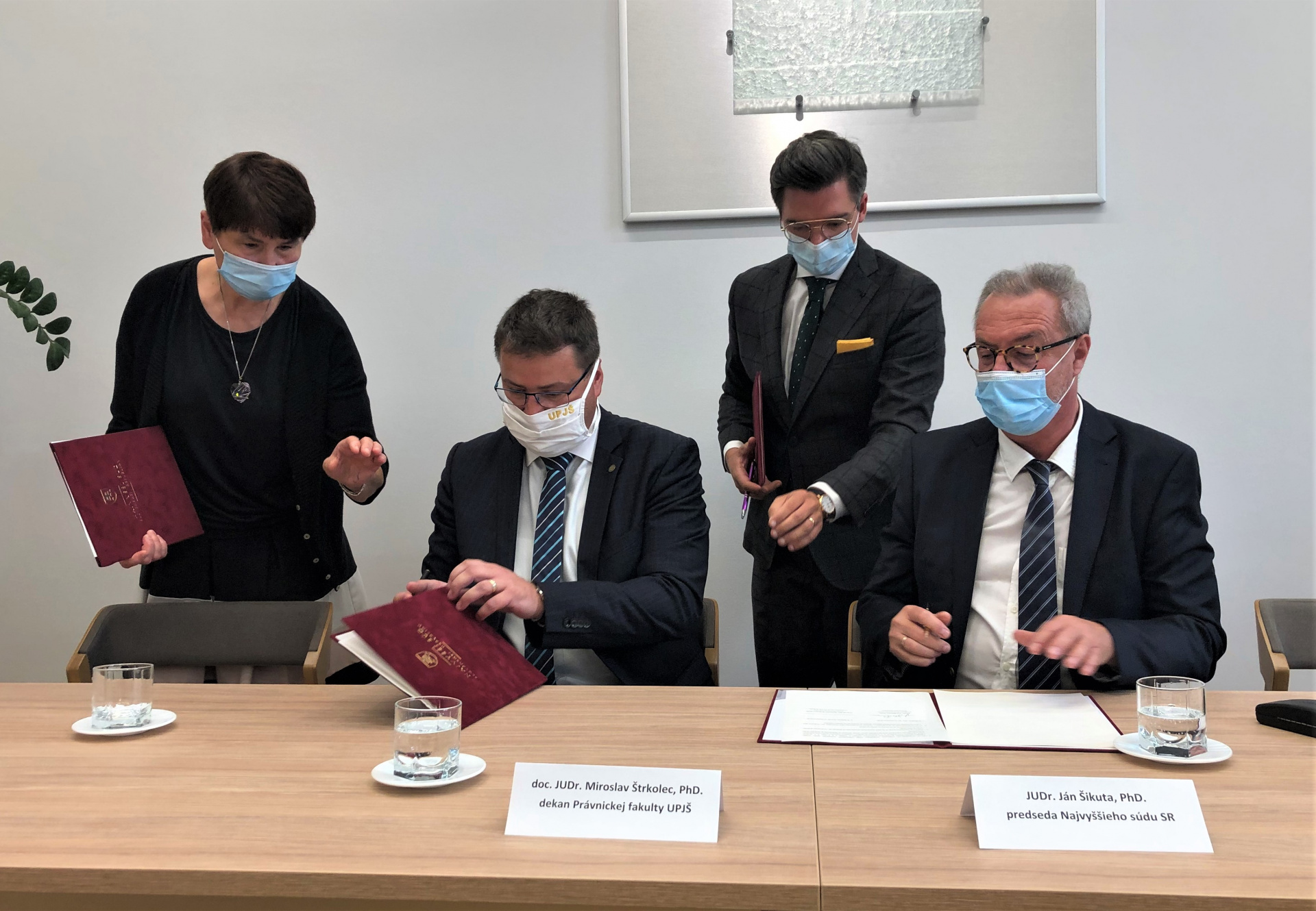 Košice, 21.09. 2020 - Predseda Najvyššieho súdu Ján Šikuta a dekan Právnickej fakulty UPJŠ v Košiciach Miroslav Štrkolec dnes podpísali Memorandum o spolupráci, ktoré umožní študentom práva zúčastniť sa bezplatných odborných stáží na pôde vrcholného orgánu všeobecného súdnictva na Slovensku. Podpis memoranda sa uskutočnil na pôde Právnickej fakulty UPJŠ za prítomnosti vedúcej kancelárie Najvyššieho súdu Zuzany Flakovej a členov akademickej obce fakulty.